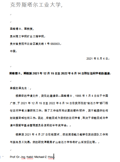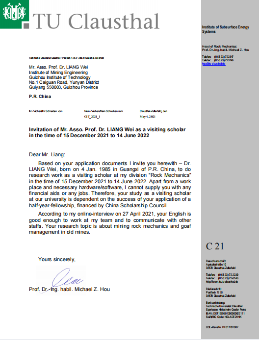 在克劳斯塔尔工业大学地下能源系统研究所Prof. Dr.-Ing. habil. Michael Z. Hou“岩石力学”部门进行访学活动。研究方向主要包括矿山岩石力学和矿山采空区处理等方面,学习矿山深部岩体损伤和采空区顶板管理的耦合数值模拟。 |