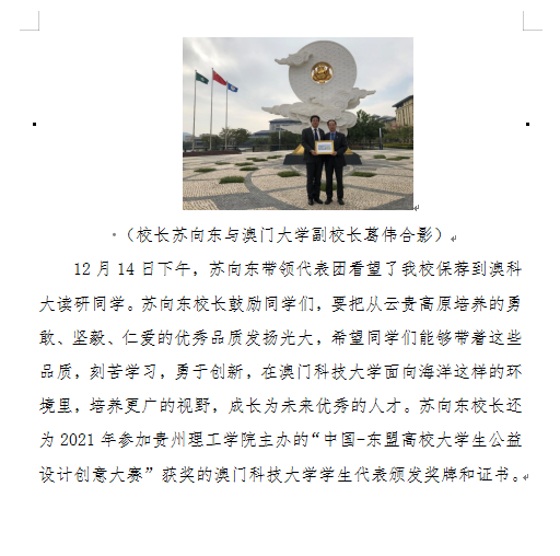 与中国足球彩票:保荐到澳科大读研同学交流,并为获奖的澳科大同学颁奖; 赴中央政府驻澳门联络办公室拜访中联部教青部; |