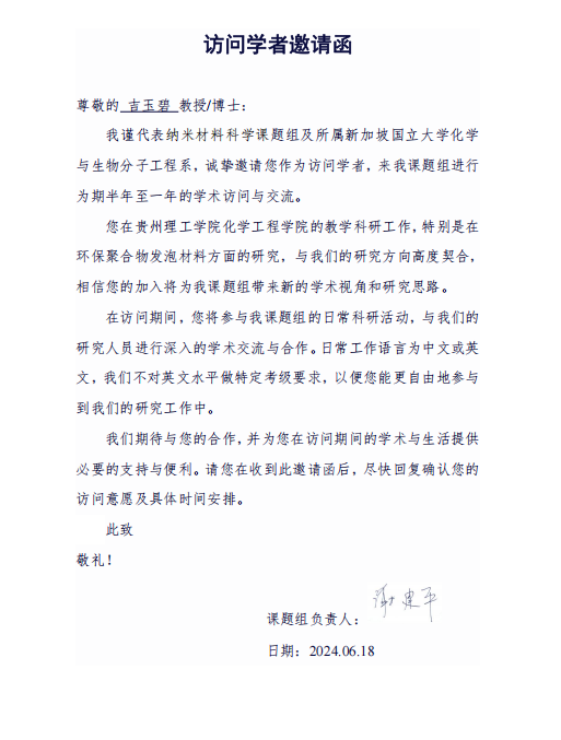 学院化学工程学院吉玉碧同志赴新加坡执行访问学者任务公示如下: