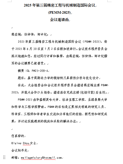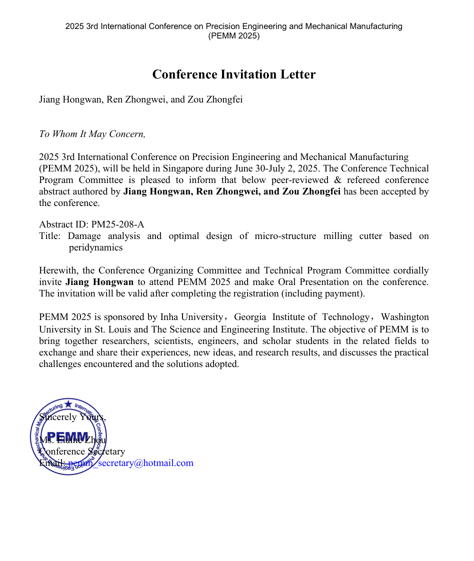 参加2025 3rd International Conference on Precision Engineering and Mechanical Manufacturing(2025年第三届精密工程与机械制造国际会议),进行学术研讨与交流,并作口头报告。 |