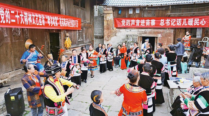 “党的声音进苗寨,总书记话儿暖民心。”贵州省安顺市普定县红色文艺“咿多哒蒙”(轻骑兵)进苗寨活动走进猫洞乡又奋村,用汉语、苗语双语结合的方式进行宣讲。 贵州日报报刊社供图 向莹/摄