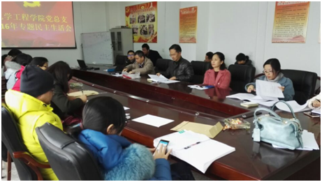 1月16日上午11:00,按照中央、省委和校党委的统一部署,化学工程学院党总支2016年领导班子专题民主生活会在主楼901会议室召开。会议由学院党总支书记徐平同志主持,化学工程学院领导班子全体成员、学院党总支全体委员参加会议,学院全体党员教师列席本次民主生活会。