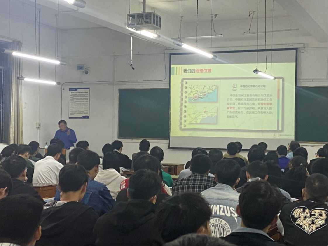 在简短的交流座谈会后,中国石化集团茂名石油化工有限公司铁运分部党委书记吴明树和铁运分部检修车间党支部书记谭毅敏在第三教学楼113教室进行了线下宣讲招聘活动。