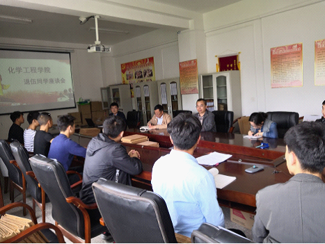 为关心我院退役复学学生的成长,了解他们在参军期间的表现及在校学习、生活情况,4月17日中午,我院在主楼901会议室召开了化学工程学院退役复学学生座谈会,院长唐安江、学生科科长蔡诚、辅导员及学院退役复学学生参加了座谈。