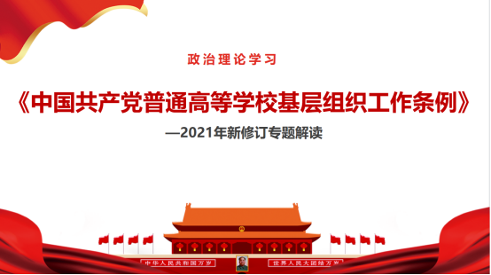 《中国共产党普通高等学校基层组织工作条例》由1996年3月印发,2010年8月进行增补、充实,内容涵盖了党组织的设置,党组织的职责,党员的教育、管理和发展,干部工作,思想政治工作,党组织对群众组织的领导以及党的纪律检查工作等,强调由党对普通高校的全面领导和建设。最后大家表示,一定要做好将社会主义核心价值体系教育融入大学生思想政治教育工作和师德师风建设的全过程,切实做好课程思政,引导学生树立正确的世界观、人生观和价值观,增强“四个意识”、坚定“四个自信”、做到“两个维护”。
