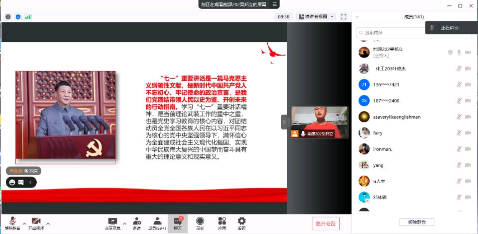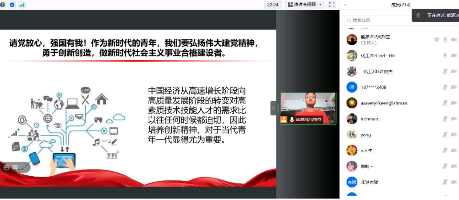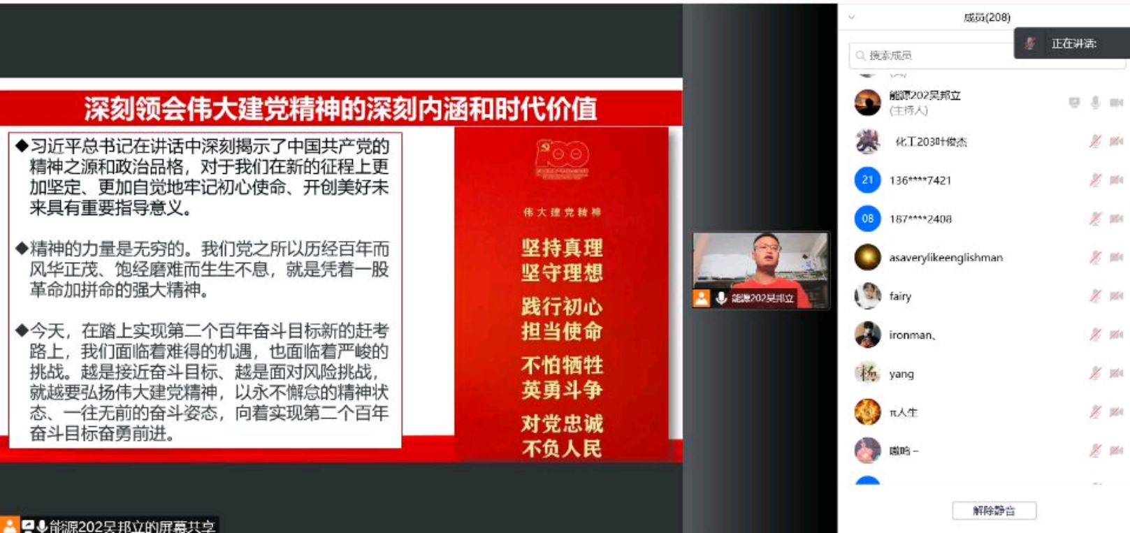 为深刻领会习近平总书记“七一”重要讲话精神的丰富内涵和精神实质,化学工程学院于9月6日晚采用线上的形式发起学习“七一”重要讲话精神会议。本次会议由贵州理工学院大学生党史宣讲团成员,化学工程学院能源202班吴邦立同学主讲,200余名化工学子与会。