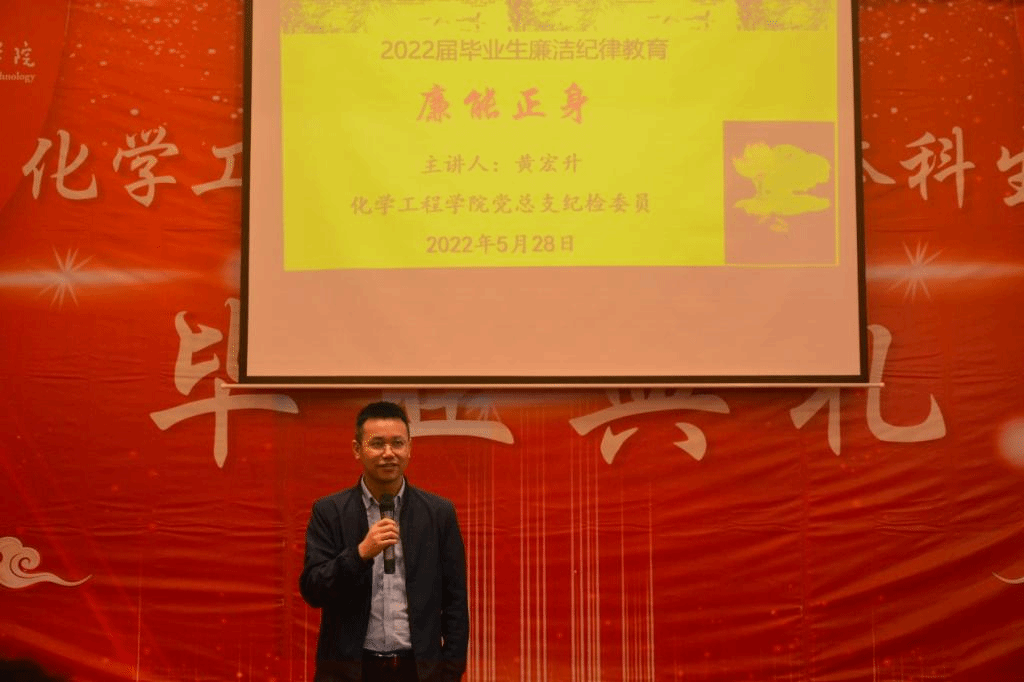 5月28日上午,化学工程学院在蔡家关校区逸夫小礼堂隆重举行2022届毕业典礼,毕业典礼上,学院开展了别具一格的“最后一课”廉洁教育,这是学院老师们对即将踏入工作岗位的同学们的殷切嘱托。毕业典礼上,化学工程学院党总支纪检委员、副院长黄宏升在逸夫小报告厅给学院全体2022届毕业生开展了毕业前廉洁教育。