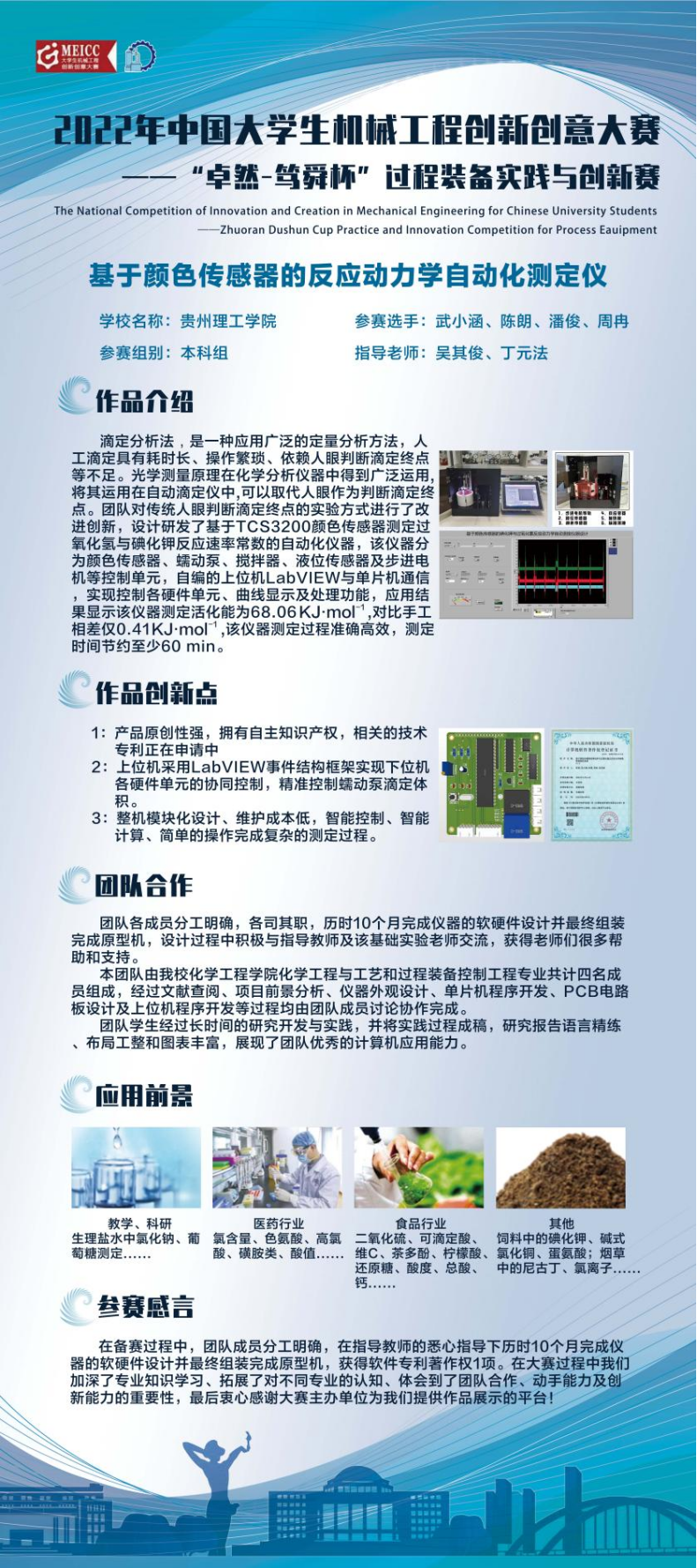 8月25日,中国大学生机械工程创新创意大赛系列赛事——“卓然-科新杯”第十三届过程装备实践与创新大赛决赛在浙江工业大学落下帷幕。贵州理工学院代表队参赛项目《基于颜色传感器的反应动力学自动化测定仪》、《基于物联网的智能型硫酸盐测定仪》分别斩获全国一等奖、三等奖,创造了贵州高校在该赛事上的历史最好成绩!同时吴其俊和丁元法两位老师被评为本届大赛的优秀指导教师。