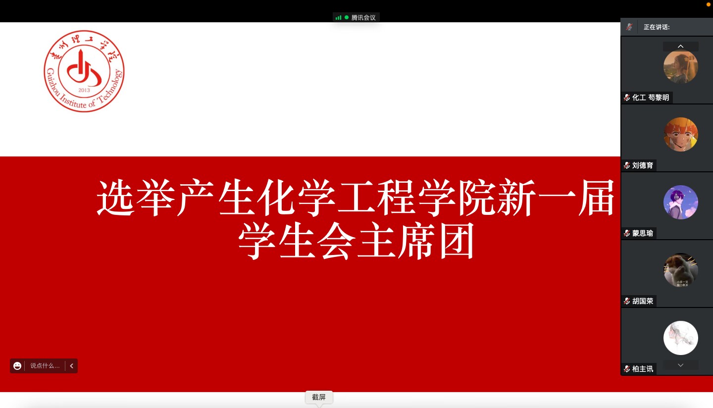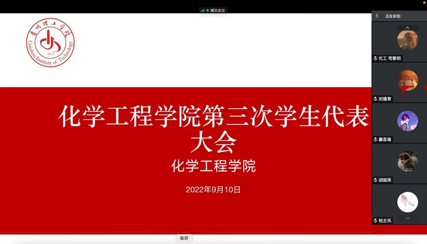 2021年9月13日,化学学院线上举行第三次学生代表大会,选举学生会主席团成员与贵州理工学院第三次学生代表大会代表。党总支副书记蔡诚到会指导,学生科副科长刘新铭老师、学生会干部以及我院75名学生代表参加会议。