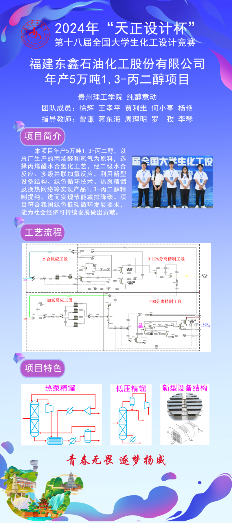 全国大学生化工设计竞赛立足于化工基本理论,激发大学生的创新思维,锻炼大学生的工程技能和团队协作精神,增强大学生的工程设计与实践能力,是我国化工类专业级别最高、参与人数最多、影响力最大的学科竞赛,是展现化工类专业大学生综合素质和创新能力的重要舞台。该赛事已经连续举办18届,竞赛题目均来源于国内化工行业重大战略需求,具有鲜明的工程背景和化工特色。本届大赛的题目是“为某大型化工企业设计一座1,3-丙二醇清洁生产的分厂,要求技术符合我国绿色低碳循环发展要求”。自3月启动以来,化学工程学院高度重视此项赛事,精心组织与指导“纯醇意动”团队以“福建东鑫石油化工股份有限公司年产5万吨1,3-丙二醇项目”为题,对该项目进行市场调研、厂址选择、可行性论证、工艺路线比选、工艺流程确定、流程模拟、设备设计与选型、自动控制、工厂与车间平立面布置、安全评价、环境评价、经济分析、清洁生产等几大模块进行可行的工艺和工程设计,使技术提升达到“中国制造2025”中提出的低碳绿色发展指标,进而利用三维建模软件对作品进行多维度展示,其设计作品具有“安全、环保、节能、创新、经济、可靠、实用”的鲜明特色。