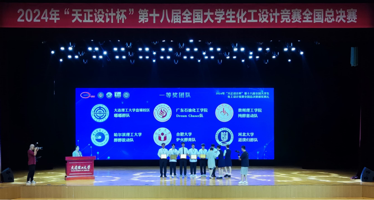 2024年8月16日-22日,第十八届全国大学生化工设计竞赛全国总决赛在大连理工大学顺利举行,贵州理工学院化学工程学院“纯醇意动”队(学生:徐辉、王孝平、贾利维、何小亭、杨艳,指导教师:曾谦、蒋东海、周理明、罗孜、李琴)取得突破,从本届参赛的450所高校近1.9万人组成的3685支队伍中脱颖而出,首次进入全国总决赛,并斩获一等奖!