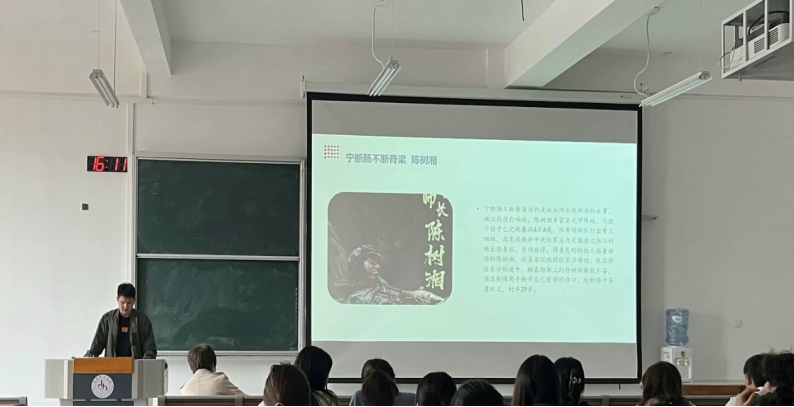 张逍同学首先带大家回顾了九一八事变,揭示了战争的创伤,然后介绍了传统节日的文化内涵与意义以及号召大家对文化遗产的保护,从而引发大家对自己行为的思考,呼吁大家铭记历史继往开来,为中国的美好未来不懈奋斗;杨小韦同学以“以史为鉴,传承精神“为入题点,以五四运动、一二九运动以及其他历史时期的大学生贡献为例,鼓励大学生学习历史知识,培养爱国情怀;付会单同学带我们重温了1840年到1945年间的苦难与战争,讲述了大学生应该通过教育创新和团结继往开来,并将其转化为推动未来发展的动力;杨宏同学的宣讲围绕抗美援朝展开,并分享了杨根思、许家明、邱少云等革命先烈的英雄事迹,铭记历史,缅怀先烈,致敬英雄。