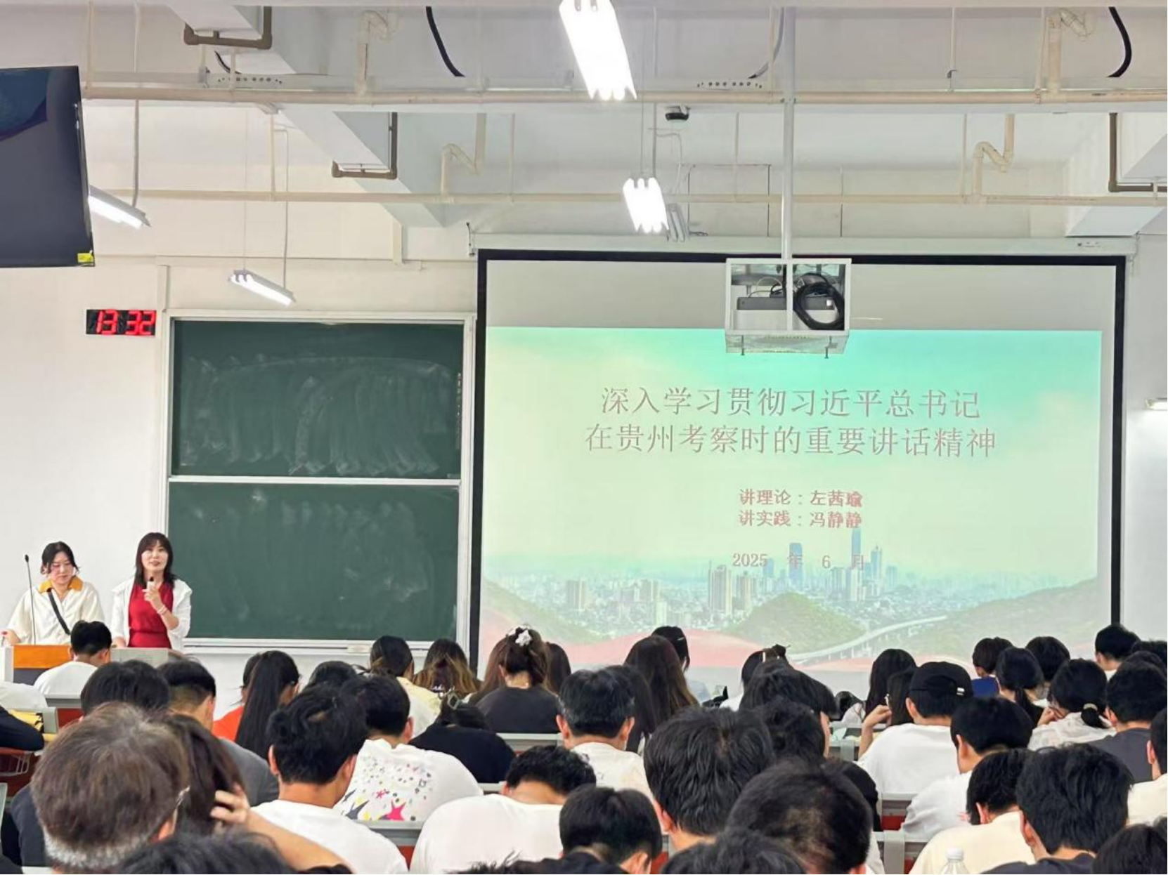2025年6月16日,化学工程学院学生党支部以“理论宣传二人讲”的形式深入学习贯彻习近平总书记在贵州考察时的重要讲话精神。此次学习活动在化学工程学院酝知楼241教室举行。由化学工程学院学生党支部书记左茜瑜老师和学生党支部纪检委员冯静静老师给2023级240余人进行宣讲,紧扣习近平总书记在贵州考察时的重要讲话精神,以“一讲理论、一讲实践”的鲜活形式,引导化工学子深刻感悟思想伟力,明确时代使命,以昂扬斗志走好新时代的长征路。
