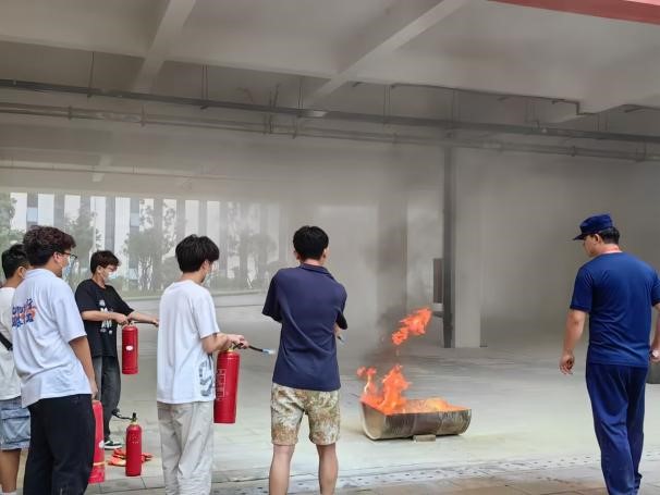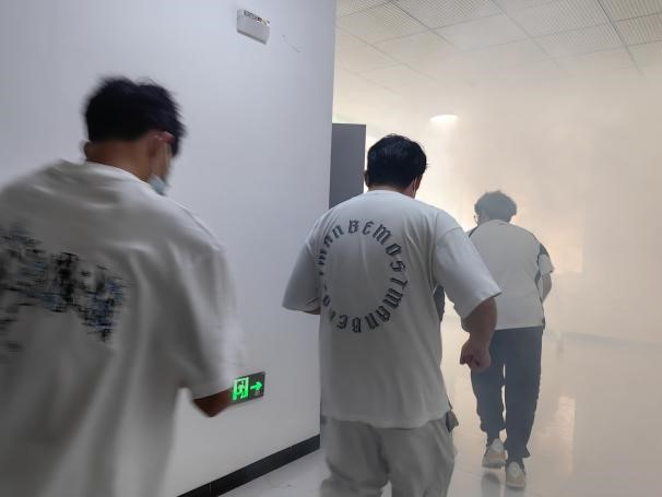 下午14:00演练开始,模拟实验室因操作不当引发火情的突发场景,现场浓烟模拟装置启动后,参与人员迅速按照应急预案,用湿毛巾捂住口鼻,低姿有序的从浓烟区撤离至安全区域。随后,保卫处专业老师演示了灭火器的规范使用方法,并组织师生逐一实操演练,切实将理论知识转化为实战能力。