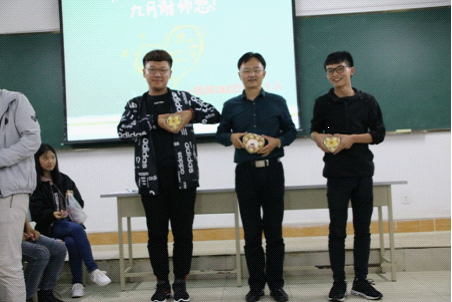在同学们齐声高唱之后,迎来了有趣的“你写我猜”游戏,同学们积极参与与老师、学长们默契配合。猜词者百思求解,表演者激情演绎、手舞足蹈,期间掌声,欢呼和欢笑声不断。在猜到最后一词时,同学们共同喊出所猜词语“老师您辛苦了”送给老师们,以表自己的感激之情。几轮竞赛之后为前三名颁奖,最后一名抽惩罚。