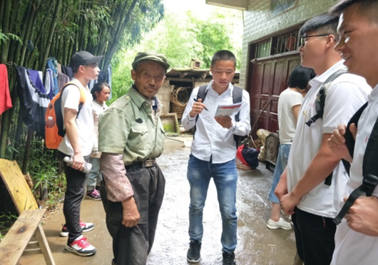 上午11时许,天气晴好,惠风和畅,志愿者们来到进新村的中寨组,走访到一老人家中。老人家的房子竹林环绕,环境清幽。志愿队员与老人聊起家常,了解其家庭情况,包括家庭人员,经济情况,对政策的认识程度等,同时也询问了他家面临的困难。老人看到我们的到来,面部洋溢着笑容,两排不齐的牙齿掩不住的倚唇外探,铜黄色的皮肤上已经满是皱纹,饱经岁月的侵蚀,但一点也没有影响到老兵的慈祥和蔼,乐观风趣的形象。
