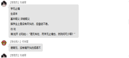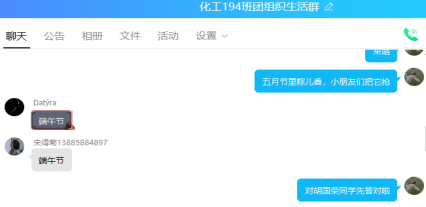 接着在进行了有趣的猜灯谜活动后,六月九日晚上八点半化工194团支部举办了“成语接龙”活动。该活动由胡国容同学组织,在本次活动中刘德育同学为大家分享的来自诗经的高山仰止,有周云梅同学分享的来自刘开的学无止境等。