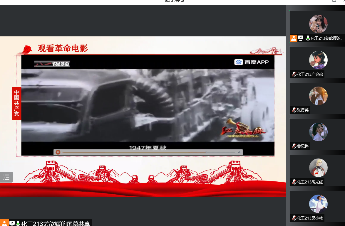 传承红色基因,赓续红色血脉,接棒时代新人,化工213班团支部于2022年9月7日组织同学们开展以“赓续红色血脉,培育时代新人”为主题的团组织活动。受疫情影响,本次活动选择在线上开展,由团支部书记姜歆媛主持,化工213班全体同学参加。