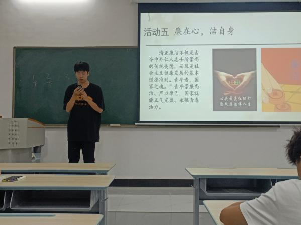 4.“廉在心,洁自身”:刘洪和殷睿枫两位同学向大家分享古今中外清正廉洁的故事,将廉洁文化深入同学们心中,树牢廉洁价值理念,铸牢廉洁思想共识和价值追求,系好人生第一粒扣子。