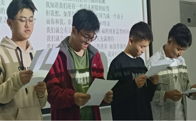 4.“诗歌朗诵”:由翟嘉鸿、汪奉林等同学为我们朗诵诗歌《赞美》,表达他们对祖国母亲忠贞的爱,培养同学们自觉为国家美好未来贡献的责任与担当。
