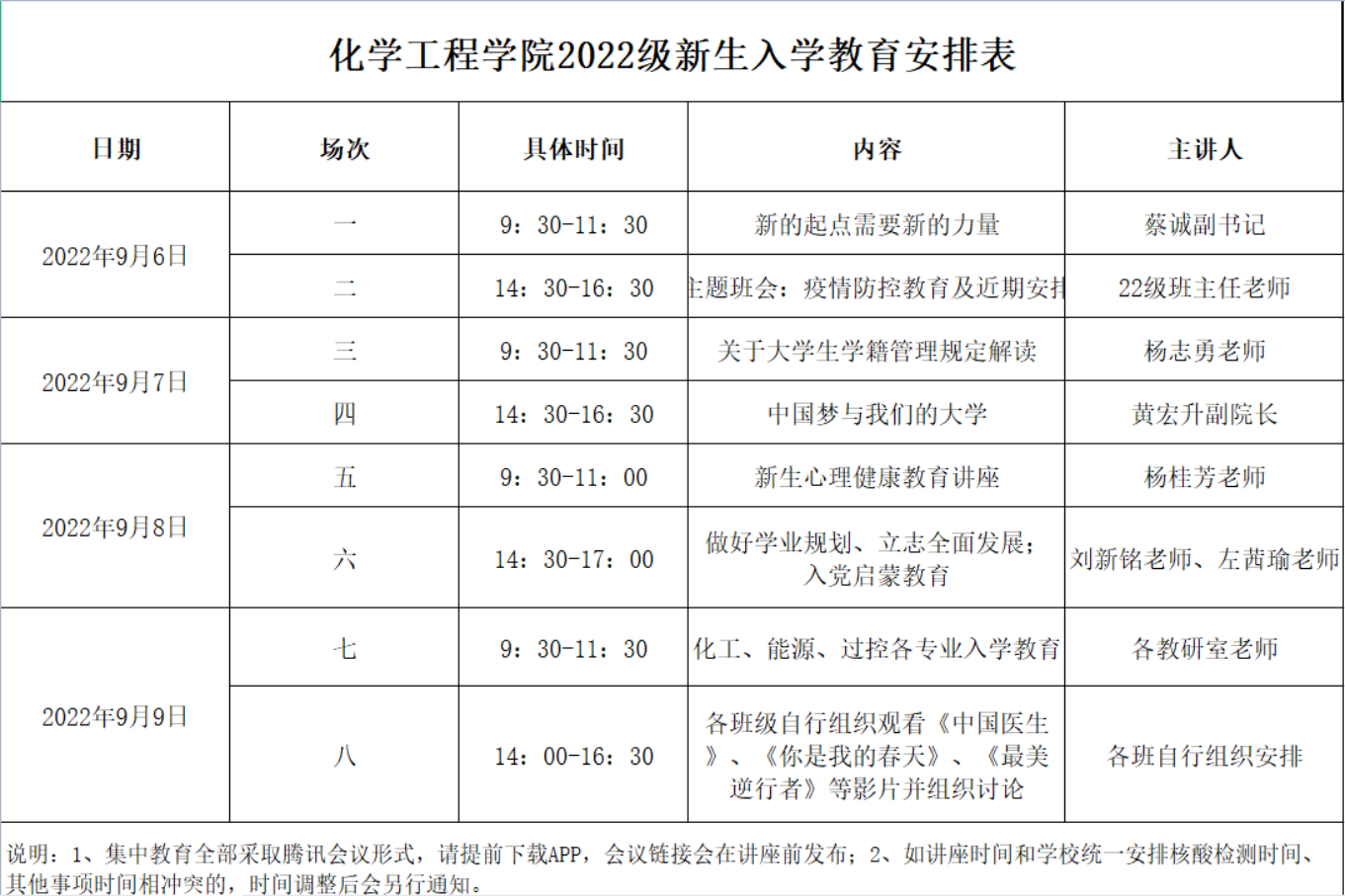 为让新生尽快适应大学生活的节奏,做好大学四年学业的规划,不让美好青春年华虚度,化学工程学院于2022年9月6日至9月9日于线上举行新生入学系列教育活动。由化学工程学院党总支副书记蔡诚、化学工程学院副院长黄宏升、教务科科长杨志勇老师、学生科副科长刘新铭、化学工程学院左茜瑜老师分别就相关内容向22级全体同学开展新生入学教育。