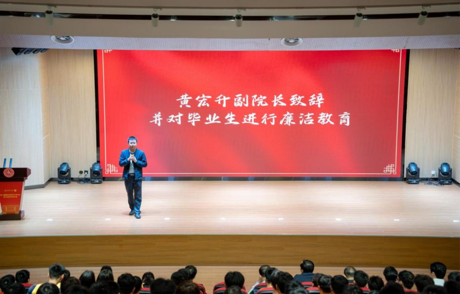 黄宏升的致辞充满了对毕业生们的祝福与期望,他说:“今天,你们即将离开这个充满智慧和激情的校园,但请记住,学习永远不会结束,愿你们带着在这里获得的知识和经验,勇敢地探索未知,创造属于你们的辉煌。”接着,他给毕业生们进行了校园最后一课:廉洁自律教育。他强调了廉洁教育的重要性,并对全体毕业生提出了殷切希望,希望大家能够通过此次学习,踏入社会后,要廉洁于心,坚定理想信念,严守纪律规矩,以实际行动践行党的宗旨。