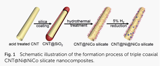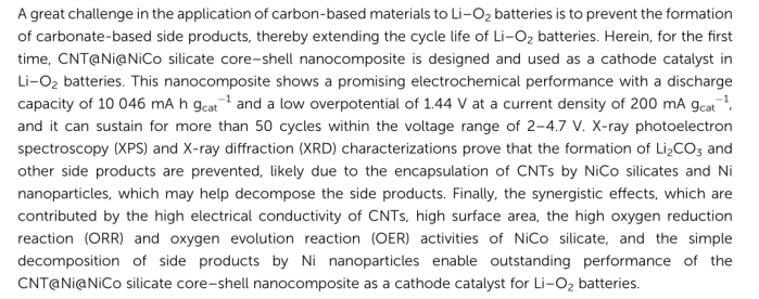 针对这些问题,我院李自卫老师与东国大学Kang Yongmook教授课题组提出,把具有高催化剂活性的镍钴硅酸盐包覆在具有高导电能力的碳纳米管表面,形成核壳型催化剂,减少碳纳米管与电解液直接接触,从而抑制碳酸锂等副产物的生成。并通过将镍钴硅酸盐部分还原出金属镍,进一步提高材料的整体电子传输能力。得到的碳纳米管@镍@镍钴硅酸盐核壳催化剂的放电容量达到10046 mAhg-1cat,循环次数达54次。该研究工作发表在材料化学A杂志上(J. Mater. Chem. A, 6, 10447-10455,2018.),影响因子8.867。