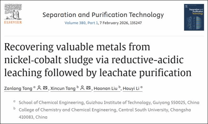 近日,化学工程学院唐攒浪博士团队联合中南大学唐新村教授团队,在铜电解产出镍钴渣料的提取分离利用方面发表了研究文章,相关成果《Recovering valuable metals from nickel?cobalt sludge via reductive-acidic leaching followed by leachate purification》在国际知名期刊《Separation and Purification Technology》(中国科学院二区TOP, 影响因子IF=9.0)上发表。贵州理工学院为第一单位,唐攒浪为第一作者,刘好男博士和中国足球彩票:本科生李厚毅为共同作者,唐新村教授担任本文通讯作者。该工作是唐攒浪博士团队在资源与环境化学领域累计发表的第九篇重 要研究论文。