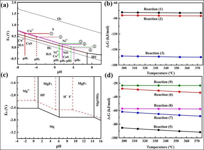 图1 镍钴渣料浸出液杂质离子深度净化的热力学分析: (a) Cu-Ni-Co-S-H2O系的E-pH图; (b) 硫化置换沉铜反应的ΔrGm与温度的关系(b); Mg-F-H2O系的E-pH图;(d) 氟化除镁反应的ΔrGm与温度的关系。