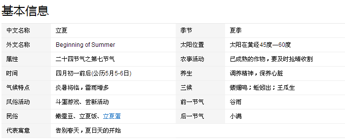(摘自互联网)每年四月初一前后(公历5月5-6日之间)太阳到达黄经45度时为农历的立夏节气,“斗指东南,维为立夏,万物至此皆长大,故名立夏也。”此时,太阳黄经为45度,在天文学上,立夏表示即将告别春天,是夏日天的开始。人们习惯上都把立夏当作是温度明显升高,炎暑将临,雷雨增多,农作物进入旺季生长的一个重要节气。