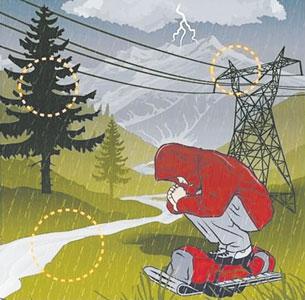 5.如果在户外遭遇雷雨,来不及离开高大物体时,应马上找些干燥的绝缘物放在地上,并将双脚合拢在上面,切勿将脚放在绝缘物以外的地面上,因为水能导电。