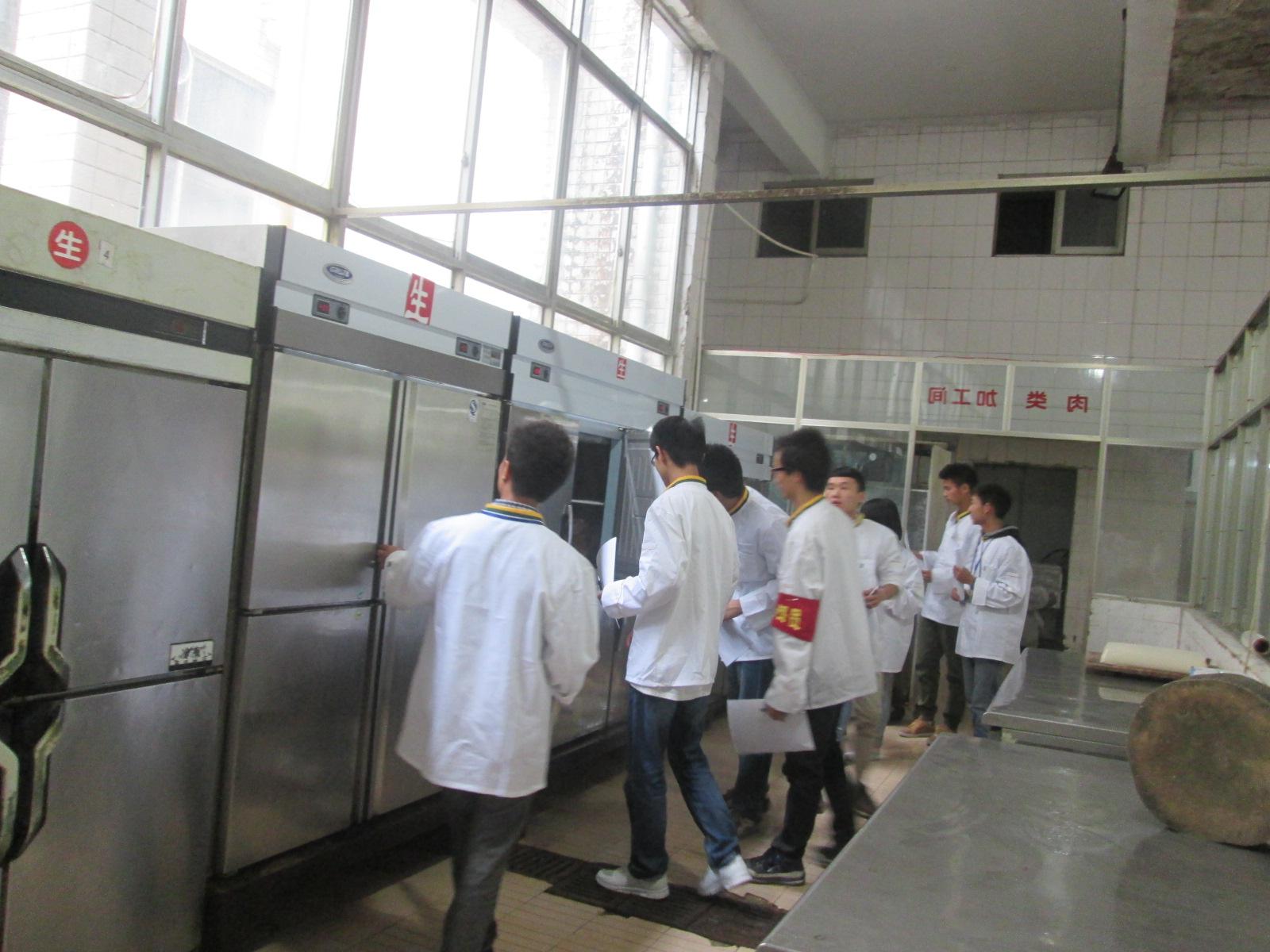 图为小组成员在一食堂检查肉类加工间