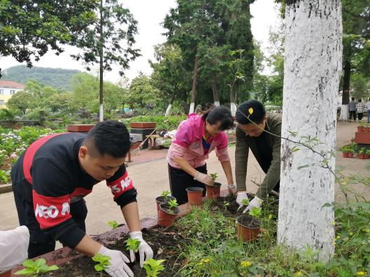 会后,全体党员开展“我为群众办实事”主题的校园环境美化花木绑扎除草活动。