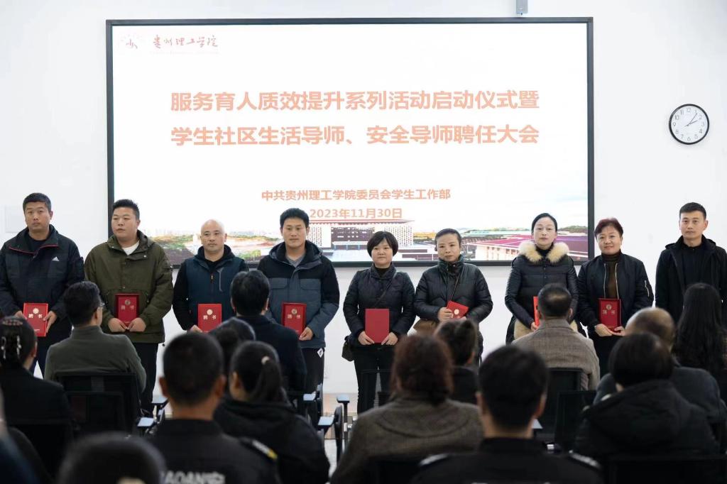 本网讯(学生工作部 杜安定)为深入推进学校“一站式”学生社区综合管理模式建设,持续有效提升服务育人成效,更好地将“三全育人”工作落细落实,11月30日下午,贵州理工学院服务育人质效提升系列活动启动仪式暨学生社区生活导师安全导师聘任大会在蕴华楼学生综合服务大厅召开。校党委书记苏向东、党委副书记高勇出席会议。校党委宣传部、学生工作部、保卫工作部、后勤管理处、科技园等相关部门负责同志,物业公司管理人员、宿管、保安以及服务商代表现场参会。