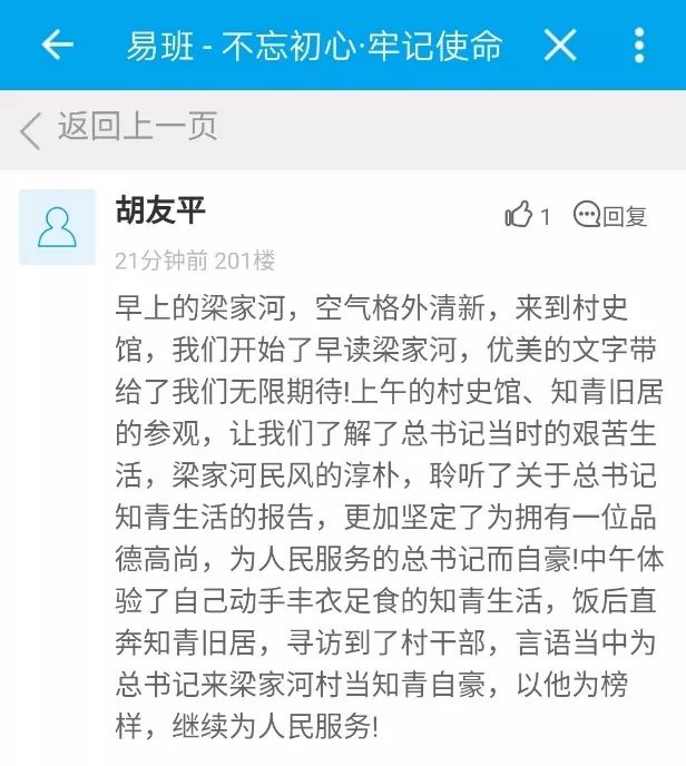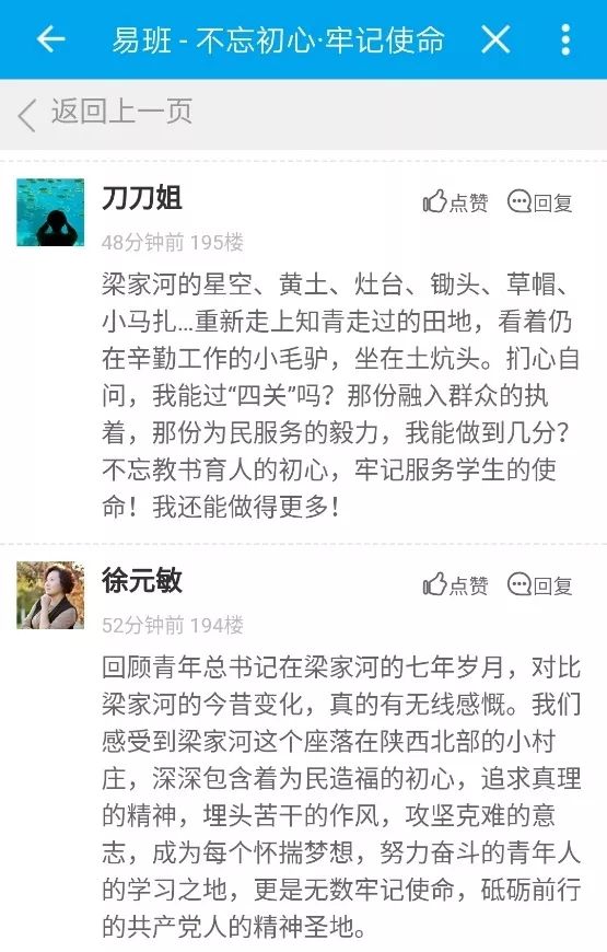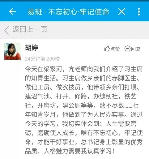 梁家河一天的学习让全体学员思潮澎湃,大家纷纷在校易班平台谈心得、话感悟。