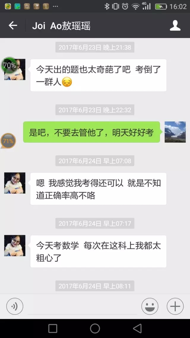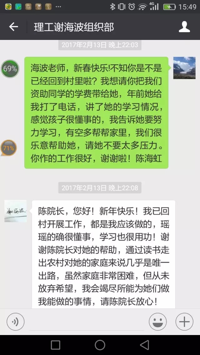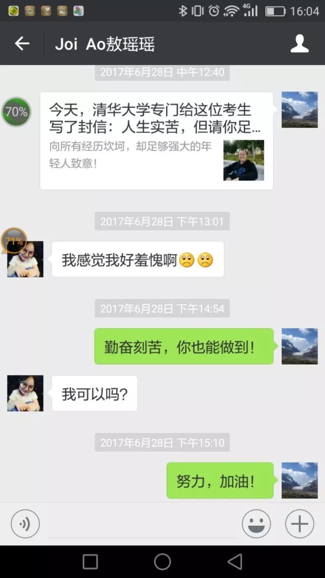 在人生成长关键时期得到的关爱和帮助,往往会对年轻人产生更大的积极的影响。转眼就要中考了,敖瑶瑶第一次面对学业生涯中的大事儿,紧张、不安以及面对不同的人生选择,不仅是她自己心中的焦虑,也让身处异乡的陈海虹教授忧心不已。“明天就像平常考试一样,正常发挥就可以了,相信自己。”“就按平时的作息时间,晚上不要复习了,放松!”……微信对话的字里行间中,处处渗透着陈海虹教授对敖瑶瑶的关心,如同一位母亲对女儿的关爱。