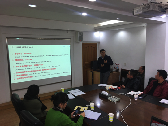 本网讯(学院办公室 郝飞,机关第六党支部 杨桂芳) 根据中央和省委《中国足球彩票在推进“两学一做”学习教育常态化制度化中迅速掀起学习贯彻党的十九大精神和习近平总书记重要讲话精神高潮的通知》精神和工作要求,12月5日上午,校党委副书记、校长龙奋杰为相关单位教职工党员宣讲党的十九大精神。校党委副书记张波,学院办公室处科级干部,食品药品制造工程学院、经济管理学院、大数据学院党政负责人及机关党委第六教工党支部全体党员参加学习。