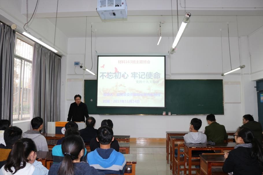 本网讯 2017年11月24日,校党委委员、副校长苏向东教授来到所担任班级导师的材料163班参加主题班会,并以“知勤知勉永奋斗,修心修业为国家”为题进行十九大精神宣讲。