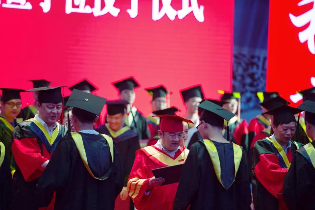 学位授予仪式上,党委书记、学位评定委员会主席曾羽宣读了授予学位的决定,随后毕业生30人一组,依次登台,校学位委员会成员为毕业生颁发学位证书、拨正流苏并合影留念。