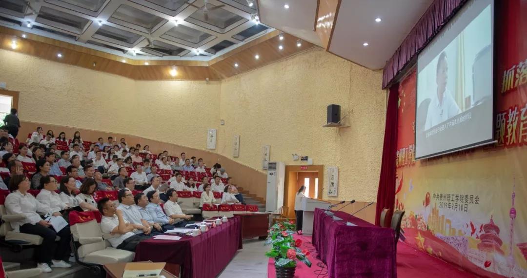 本网讯(纪委监察室 周伟/文 记者团 王志凌/图)2019年9月10日,“不忘初心、牢记使命”主题教育警示教育大会在贵州理工学院逸夫小礼堂举行,校领导曾羽、张波、宋建波、苏向东、胡兴灿出席,全校处科级领导干部、基层党委(党总支)班子成员、党支部班子成员、师生党员代表参加大会。会议由校党委副书记张波主持。