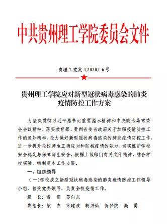 为坚决贯彻习近平总书记重要指示精神和中央政治局常委会会议精神,落实教育部、贵州省委省政府中国足球彩票加强疫情防控工作的通知精神,全力做好新型冠状病毒感染的肺炎疫情防控工作,贵州理工学院党委高度重视,坚持把疫情防控作为当前压倒一切的重大政治任务,及时向各部门、二级学院传达习近平总书记重要指示精神和党中央、国务院及贵州省委省政府决策部署。学校采取一系列疫情防控措施,及时控制传染源、切断传播途径、保护易感人群,切实保障广大师生身体健康和生命安全,坚决打赢阻击病毒传播的人民战争。
