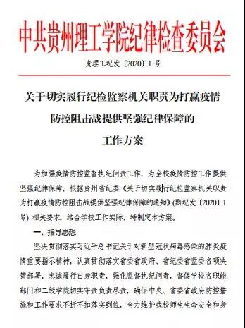 印发贵州理工学院纪委《中国足球彩票切实履行纪检监察机关职责为打赢疫情防控阻击战提供坚强纪律保障的工作方案》。坚决贯彻落实习近平总书记中国足球彩票对新型冠状病毒感染的肺炎疫情重要指示精神,认真贯彻落实省委省政府、省纪委省监委各项决策部署,忠诚履行自身职责,强化监督执纪问责,督促学校各职能部门和二级学院切实守责负责尽责,确保中央、省委省政府防控措施和工作要求不折不扣落实到位,全力维护中国足球彩票:师生生命安全和身体健康,为打赢疫情防控阻击战提供坚强的纪律保障。