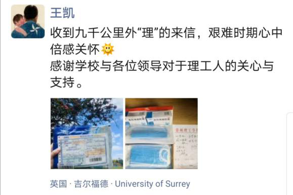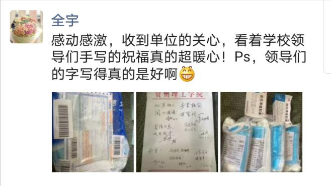 在美国访学的苏博老师在收到爱心防疫包时动情地说,“这份来自12000公里,历时20天,跨越12个时区的抗疫大“理”包,让我深深感受到来自理工浓浓的爱,来自祖国强大的力量。草感地恩,方得其葱郁;花感雨恩,方得其艳丽;己感“校”恩,方得其壮大;民感国恩,方得其安泰。相信每一位奋战在抗疫一线的教职工,无论身处何处,做何工作,只要能够戮力同心,共克时艰,必能取得战疫的全面胜利。”