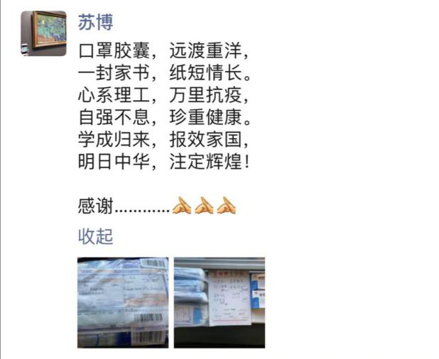 “烽火连三月,家书抵万金”,随着防疫物品一同寄出的还有校领导亲手写下的慰问语,亲切的话语表达了对海外留学教师们的深切挂念与体贴关怀。