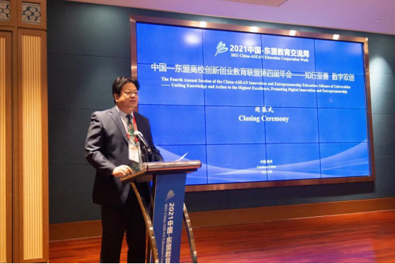 贵州理工学院党委副书记、校长苏向东致闭幕辞,希望中国与东盟的高校携起手来,充分运用好“中国—东盟高校创新创业教育联盟”取得的成果,推动数字与“双创”融合发展,提高数字技术与高校创新创业教育领域深度融合,共同促进高等教育繁荣!