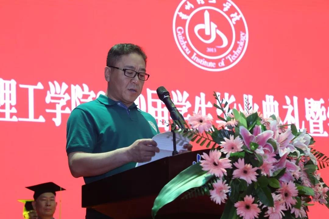 毕业生家长代表机械工程学院机自152班王东岩同学的父亲王晓春先生发言,感谢贵州理工学院的领导和老师四年来对孩子们的关爱与培养,祝贺孩子们顺利毕业,希望孩子们为了年轻的事业,为了那绝顶的风光,为了中华民族的伟大复兴……整理行囊再出发!相信孩子们未来的路会越走越宽广!