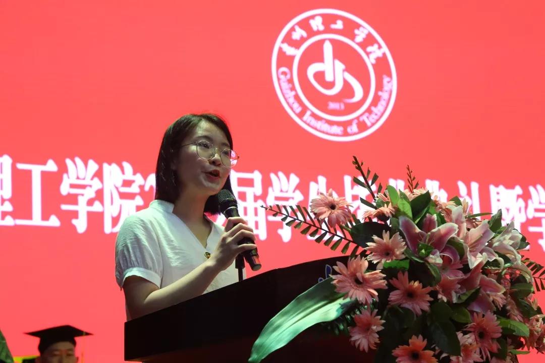 毕业生代表经济管理学院造价152班的蔡君同学发言,深情回顾在理工忙碌而充实的四年时光,向母校、向师长、向朝夕相处的同窗、向这段不能忘怀的美好岁月依依惜别。在扬帆启程之际,祝愿全体老师硕果累累,桃李芬芳,祝愿母校前程似锦、蒸蒸日上,祝愿母校的明天更加灿烂辉煌!