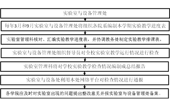 (2)运行阶段:实验室与设备管理处组织督导员对全校实验室教学运行情况进行检查,实验室管理科将对学校实验教学检查情况编制成总结报告,并利用实验室设备处网络平台对检查情况进行通报。