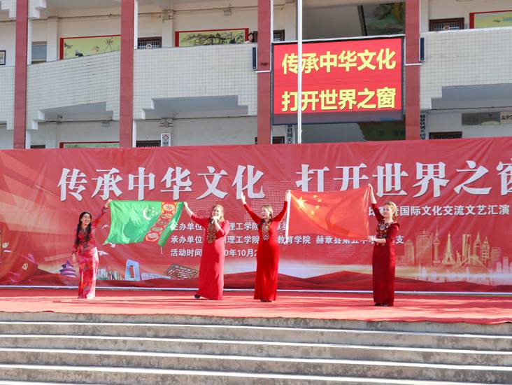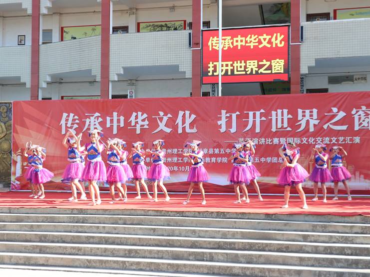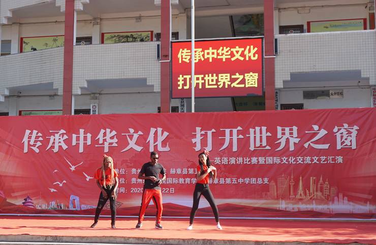 演讲比赛结束后,国际教育学院国际学生和赫章县第五中学同学们进行了文艺汇演表演。国际学生独具民族文化特色的歌舞,赢得赫章县第五中学师生们的阵阵喝彩。