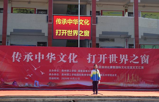 本网讯(国际教育学院 黎娟)为进一步落实2020年“一总支一项目”工作,经过前期沟通和准备,国际教育学院党总支充分发挥自身特色和优势,于10月22日继续走进赫章县第五中学,开展“传承中华文化,打开世界之窗——英语演讲比赛暨国际文化交流文艺汇演”教育扶贫活动。国际教育学院党总支书记孙凯、院长乔靖、党总支副书记杜玉红,赫章县教育局教研室教研员李伟及赫章县第五中学校长舒鹏、副校长李曦、副校长朱国强出席了此次活动。